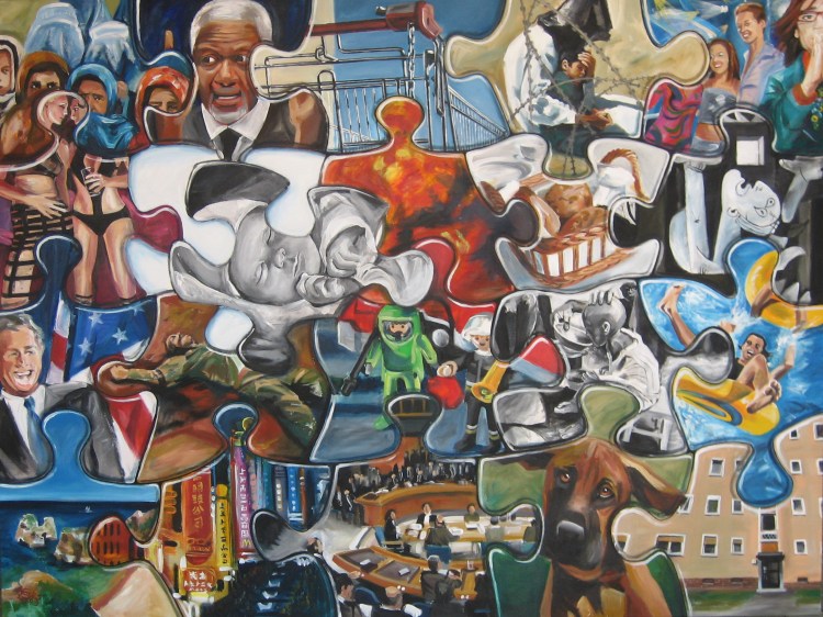 Dass mit George W. Bush und Kofi Annan zwei schon von der Weltbühne mehr oder weniger abgetretene Aktive abgebildet sind, darf nicht darüber hinwegtäuschen, dass ich das Gemälde aktuell erneuern könnte und müsste… vielleicht fänden Donald Trump, Wladimir Putin oder António Guterres Eingang ins Werk, die Geiseln der Hamas, die Raketen über oder die sinnlose Zerstörung in der Ukraine, die weltweiten Überschwemmungen, plastikübersäte Strände und statt des unscheinbaren Hauses eines Kindermörders in der Ecke rechts unten die ebenso unspektakuläre Wohnung eines beliebigen Attentäters. Da hätte ich dann leider eine zunehmend reiche Auswahl, links- oder rechtsradikal, religiös fanatisch oder »lediglich« durch alle gesellschaftlichen Raster gefallen oder psychisch labil.