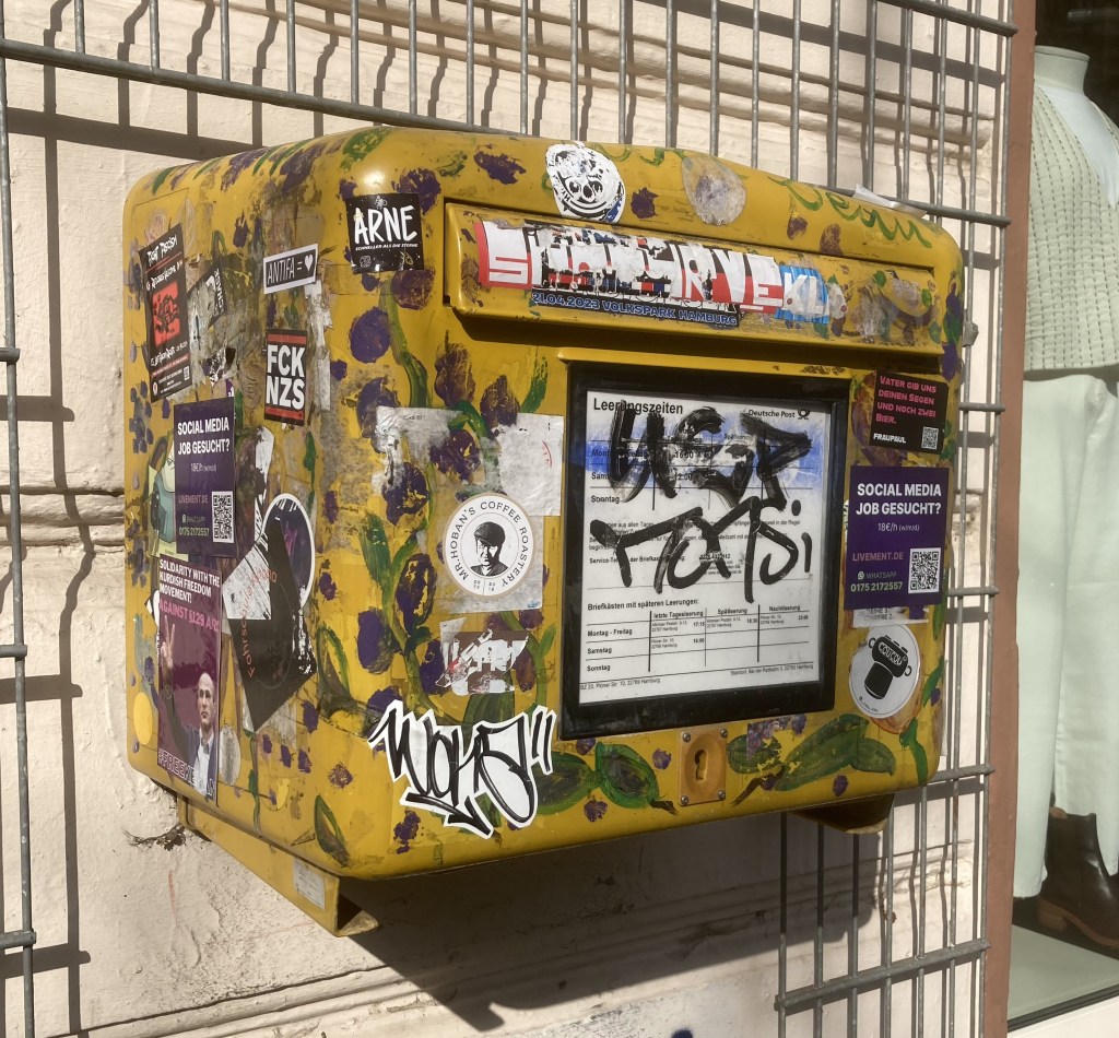 Der abgebildete Postkasten aus Hamburg Ottensen hält mir mir gemeinsam tapfer durch und nimmt (noch) fleißig Post an. So beklebt, bemalt und ramponiert er auch aussehen mag – die Geburtstags-Gratulations-Dankeskarte (als Reaktion auf eine Mail, sorry!), die ich dort einsteckte, ist umgehend beim Empfänger angekommen. Ein Hoch auf die deutsche Post, so lange sie noch austrägt, bis wir das Post-Aufgeben aufgeben.