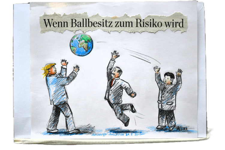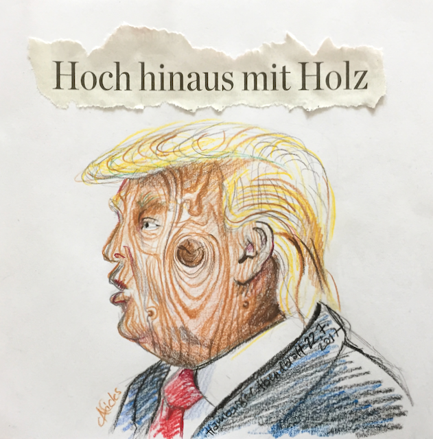 Meine zur Verfügung stehenden Waffen beschränken sich auf Zeichenstift und Pinsel. Manchmal zeichne oder male ich also gegen meine Wut, Angst und Verzweiflung an, wie z. B. bei meinem Schlagzeilen-Projekt (was vermutlich meine Einreise in die Vereinigten Staaten unmöglich macht, solange der Orange im Evil Office sitzt). Aber mein kluger Sohn hat mir geraten, mich eben nicht mehr mit ihm zu beschäftigen, weil es exakt das ist, was er und seine fragwürdigen Berater wollen. Belasse ich es also bei den schon im Jahr 2017 entstandenen zeichnerischen Kommentaren, die zur allgemeinen Frustration weiterhin ihre Gültigkeit haben.