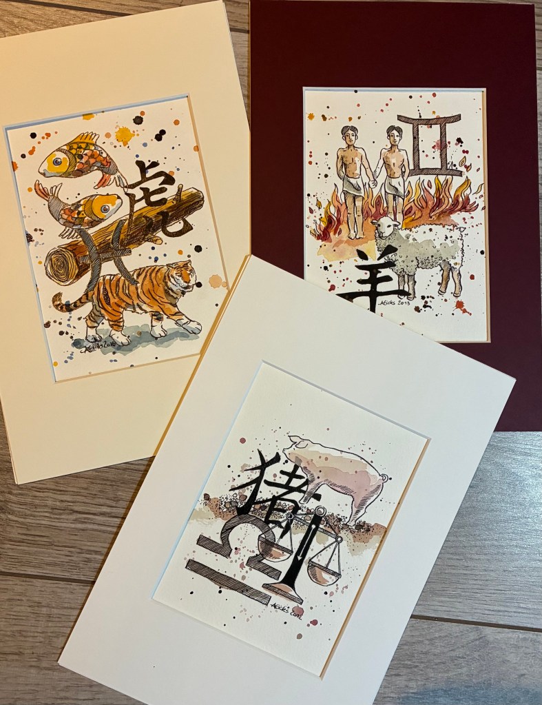 Ich trenne vom Baum meines Portfolios einen Produktzweig ab, den ich seit zwölf Jahren im Programm hatte: kleine, feine Sternzeichengrafiken, koloriert mit Aquarellfarben. Dies ist allein der Tatsache geschuldet, dass ich umfangreich Neues anfangen, mich fokussieren und deshalb mein Archiv leeren möchte (auch wenn in diesem Fall das reine Volumen in Bezug auf das Fassungsvermögen meines Kunst-Stauraums keine echte Rolle spielt). Je nachdem, wie viel Werbung ich für diese Federzeichnungen jeweils gemacht hatte, kamen verlässlich Aufträge dafür rein, aber mein Springhirn braucht an dieser Stelle jetzt Ruhe. Auch wenn ich es nicht geschafft habe, alle 720 möglichen Kombinationen aus Tierkreiszeichen und chinesischem Geburtsjahr anzufertigen, was das kleine, sprunghafte Eichhörnchen in meinem inneren Team sammelwütig forciert hat: ich bin nun bereit, mit ach, dieser Lücke, dieser entsetzlichen, zu leben. (Exkurs: Bitte geht ins Kino und schaut euch die sehenswerte Meyerhoff-Verfilmung an!)