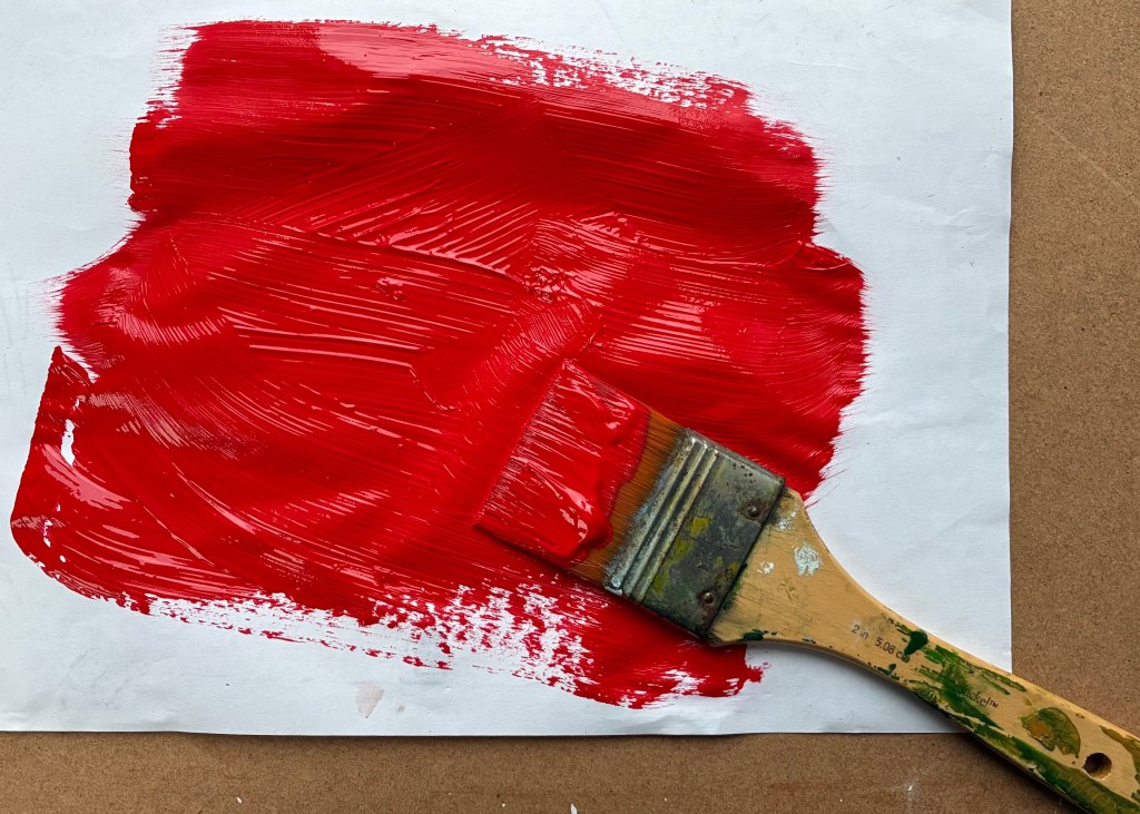 Dann lege ich den Pinsel aus der Hand und betrachte mein Bild lange. Dann, nach einer Weile, stehe ich auf, nehme den dicksten Pinsel aus dem Regal, gehe an den Tisch zurück, tauche den Pinsel in die Farbe, führe ihn über das Bild und streiche es sorgfältig genau, langsam und bedächtig mit roter Farbe zu.