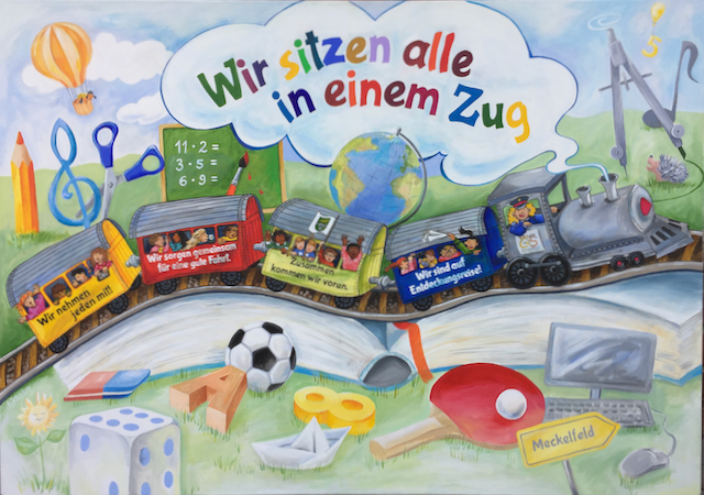 [10 & 11] Für die Grundschule Meckelfeld habe ich ein Logo und das Leitbild entworfen. Das Logo, das alle offiziellen Präsentationen der Schule (Briefkopf, Zeugnisse, Flaggen etc.) ziert, greift in der Farbgebung die baulichen Gegebenheiten (Türen- & Flügelfarben) auf. Das Leitbild präsentiert an diversen Orten des Gebäudes das Motto der Schule.