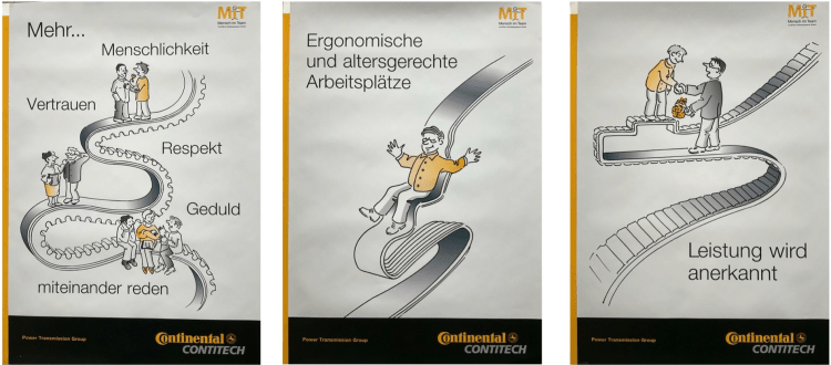 [7] Die drei Plakate dienen der Mitarbeiter-Motivation bei Continental. Von mir stammen die Illustrationen (s/w-Form) inklusive der Entwicklung der Ideen, wie man zum Claim passend die Produkte (= Antriebsriemen) einbauen kann.