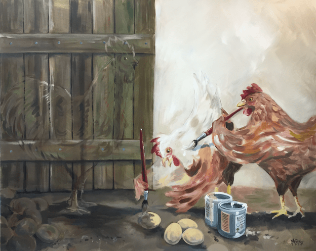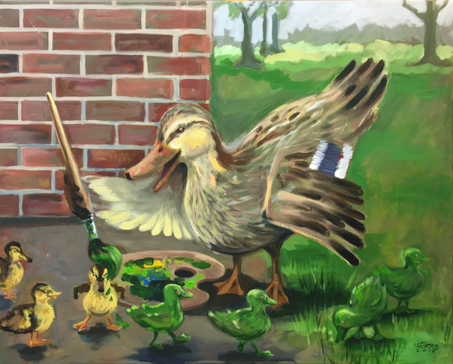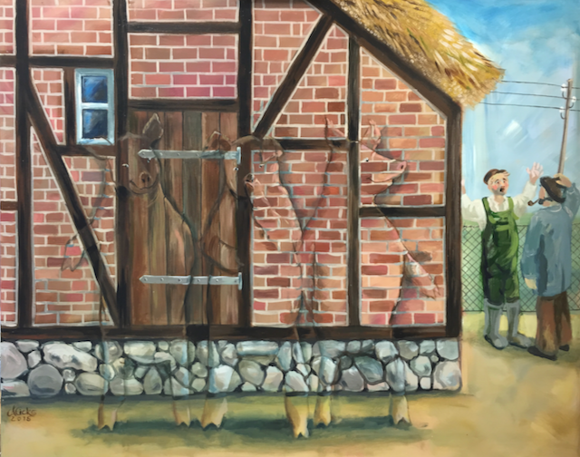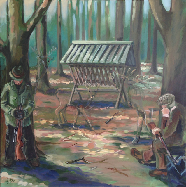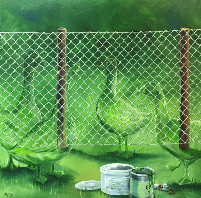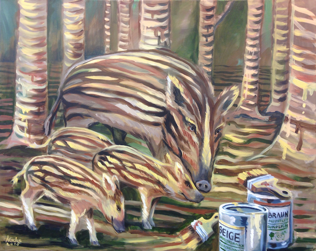 Die Gemälde-Serie NATÜRLICH.TIERISCH.GETARNT! versucht auf spielerische und augenzwinkernde Weise, beides zusammenzubringen:
