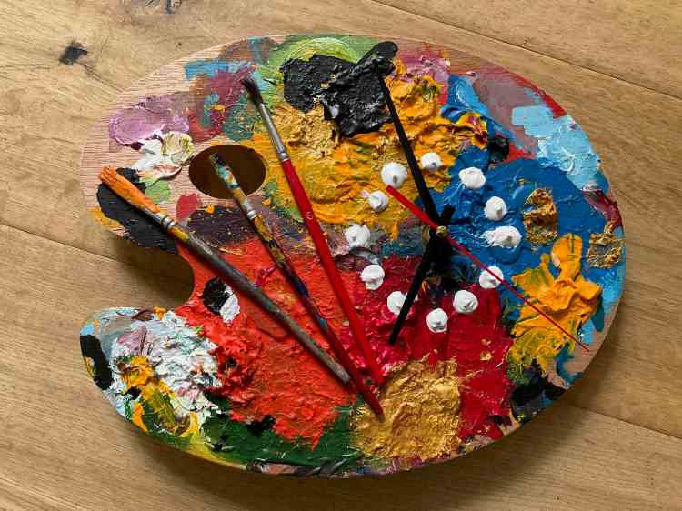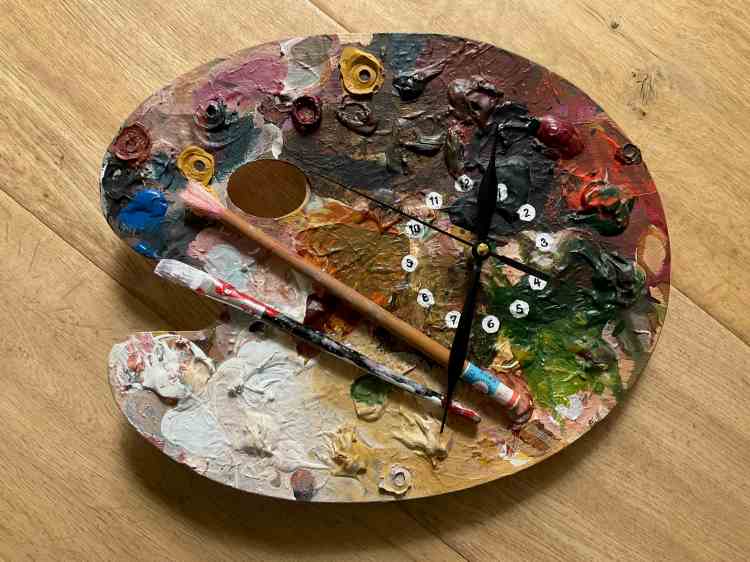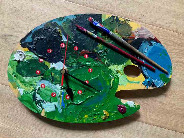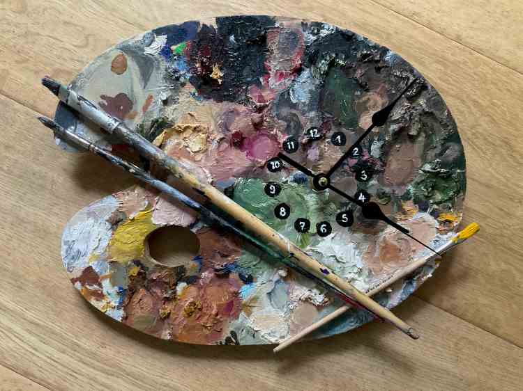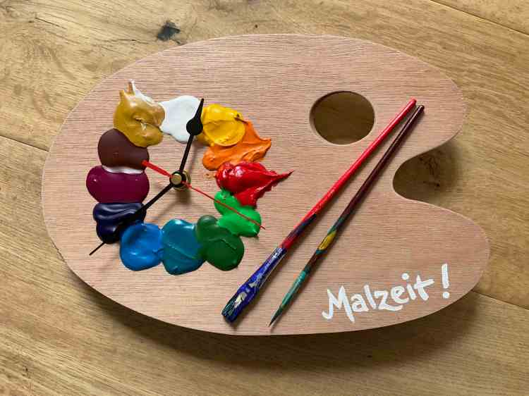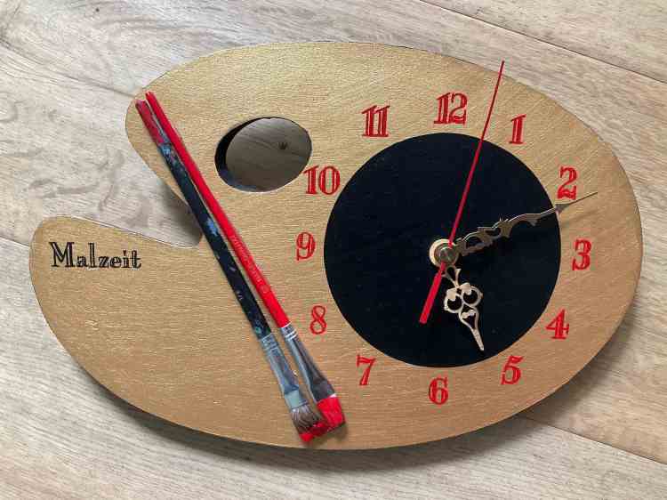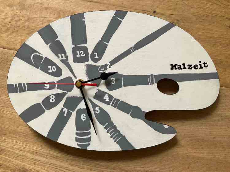 Diese Wanduhren stelle ich aus Original-Malpaletten her. Versehen mit einem nicht-tickenden Quarzuhrwerk zeigen sie Ihnen die korrekte ›Malzeit‹ an.