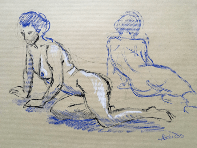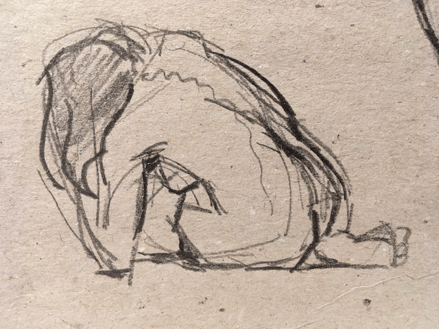 WEIBLICHER AKT – KAUERND: Graphit auf Graupapier, 8 x 10 cm, 2020