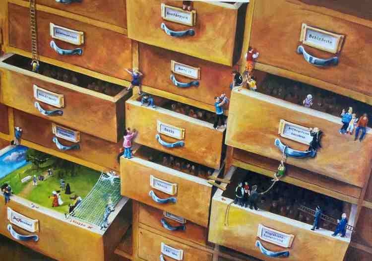 [5] Als mein großer Renner immer wieder nachgefragt: das Poster »Schubladen« – ursprünglich ein Ölgemälde (seit langem verkauft) jetzt als Poster DIN A2 (auch als Leinwanddruck oder Postkarte; s. u.).