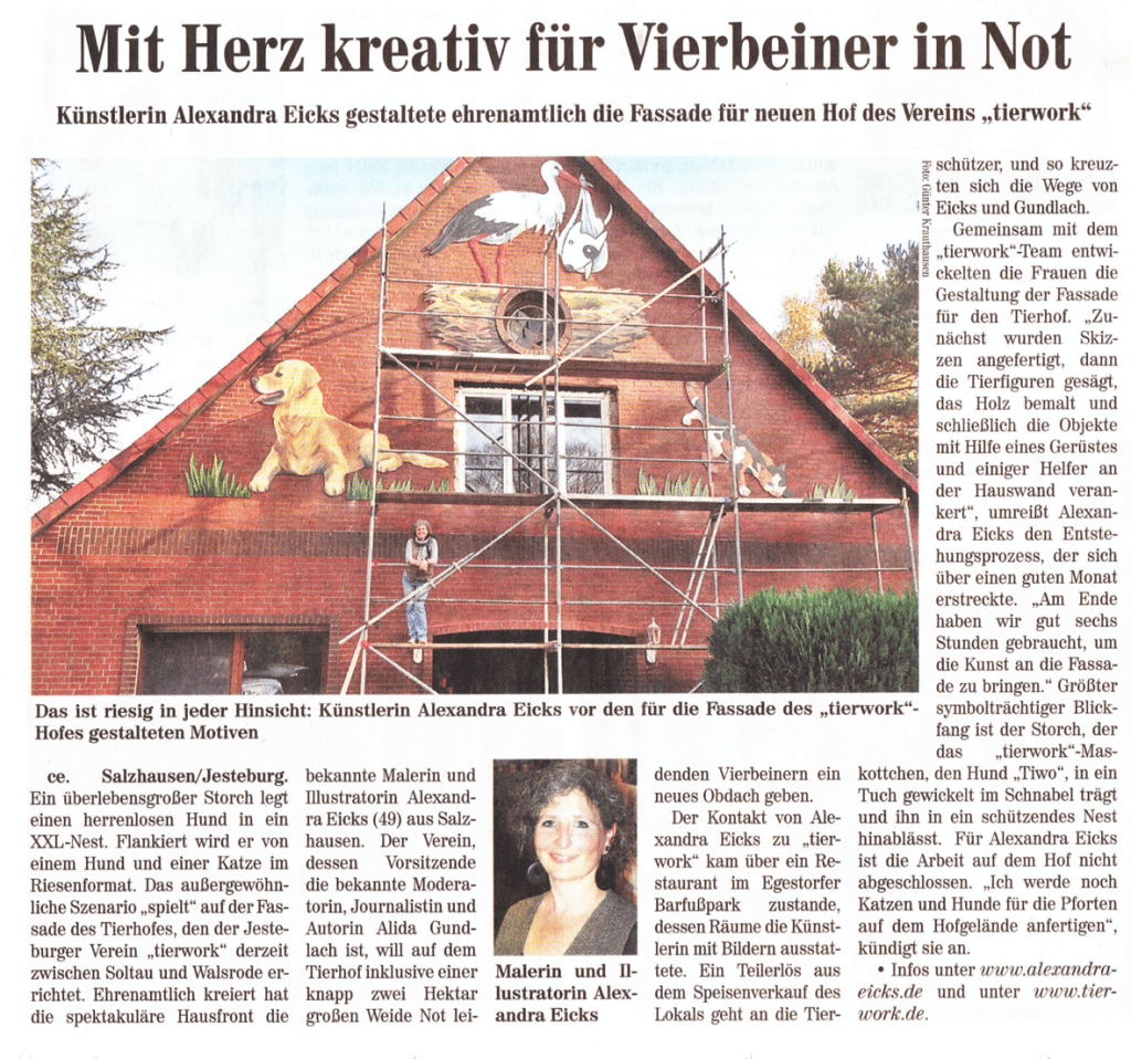 PR Über die Fassadengestaltung für den tierwork e. V. der Tierschützerin, TV-Moderatorin und Autorin Alida Gundlach berichtete die Kreiszeitung am 03.01.2015: Seiten: 1 2 3 4 5 6 7 8 9
