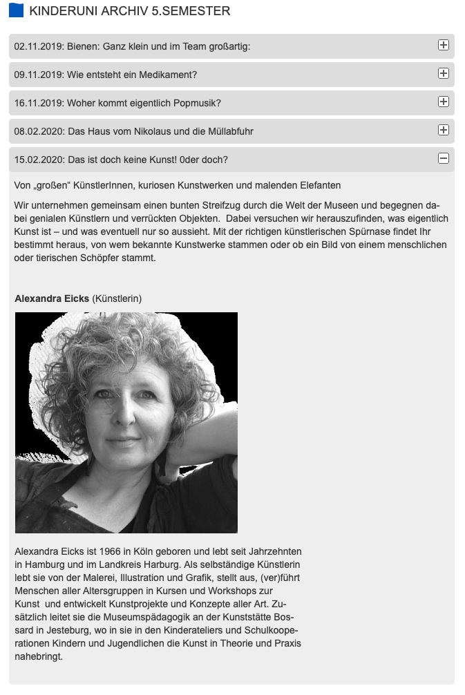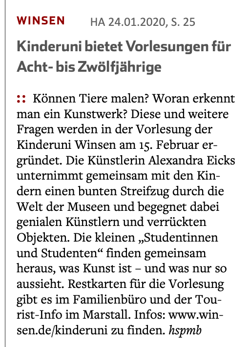 In meinen Kunstkursen für Kinder liegt mir die Förderung der Kreativität bei dieser Altersgruppe besonders am Herzen. Daher habe ich sehr gerne die Einladung der Kinder-Uni Winsen zu einem Gastvortrag im Wintersemester 2019/20 angenommen.
