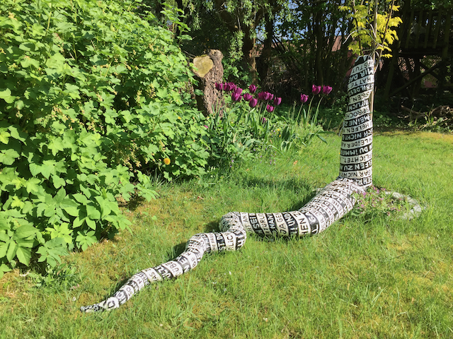 FALSCHE SCHLANGE: Drahtgeflecht, Pappmaché, Gipsbinden & Acrylfarbe, Länge ca. 140 cm, ca. 55 cm in die Höhe, 2009