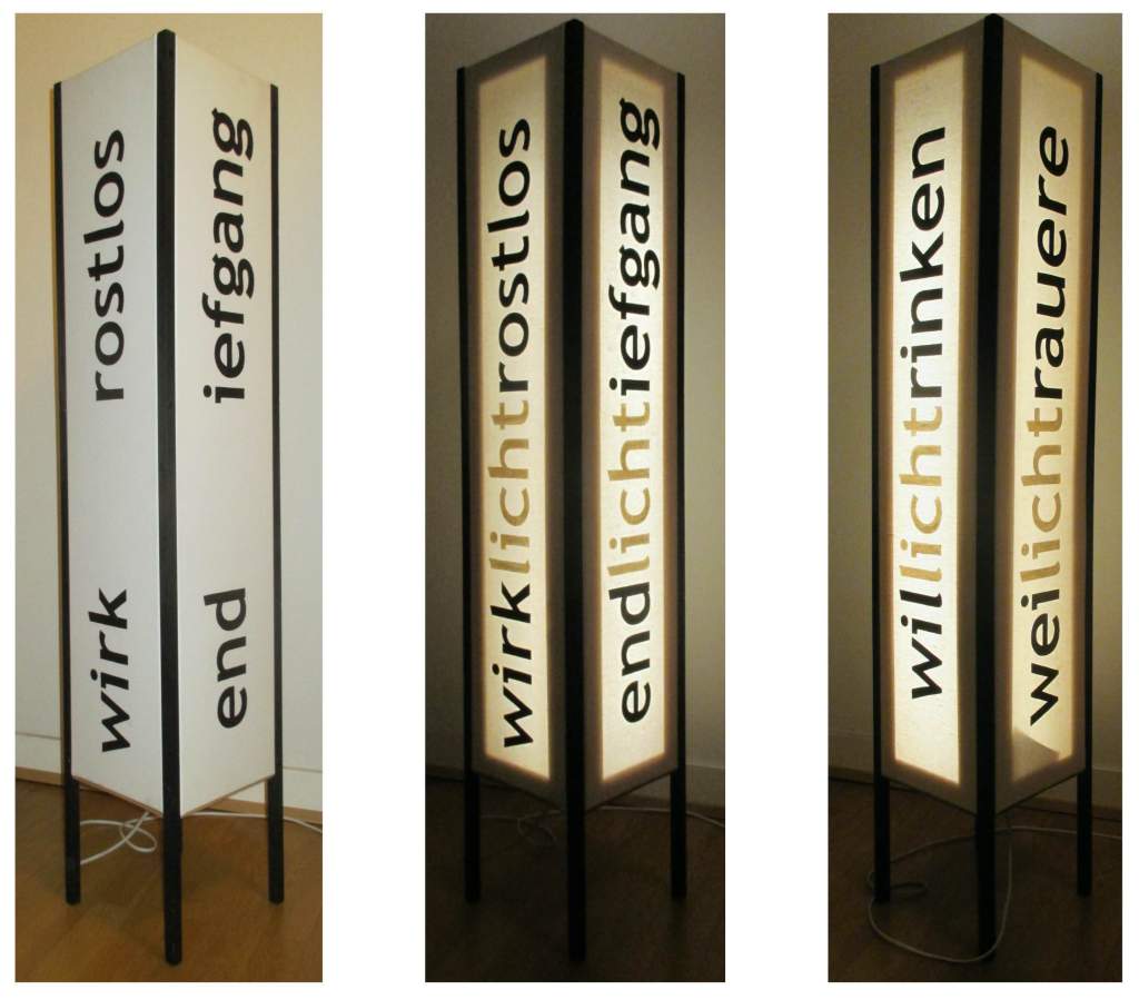 LICHT-LAMPE | 23 x 23 x 121 | vier beschriftete Keilrahmen jeweils mit dem Bestandteil »licht«. Der komplette Text ist nur im eingeschalteten Zustand sichtbar