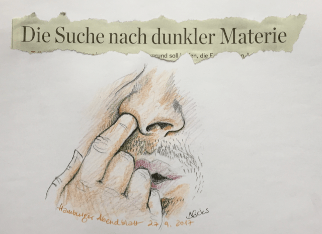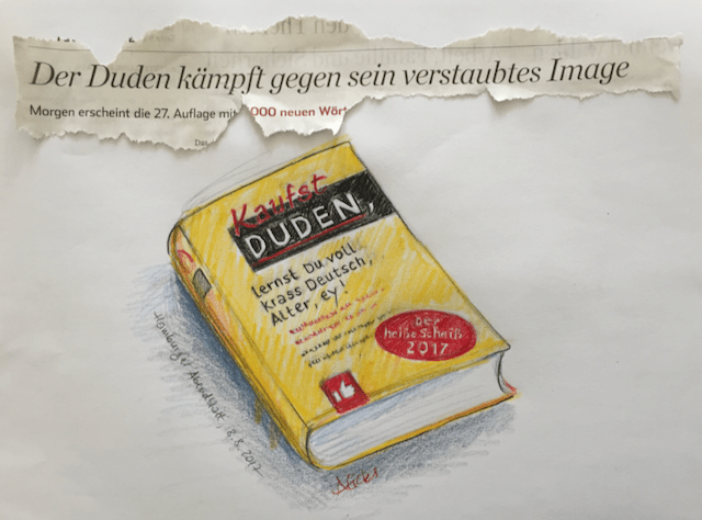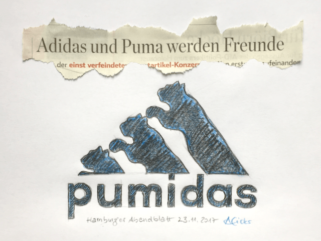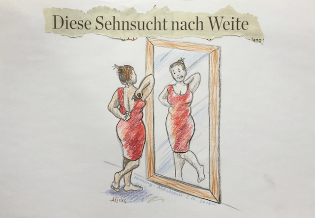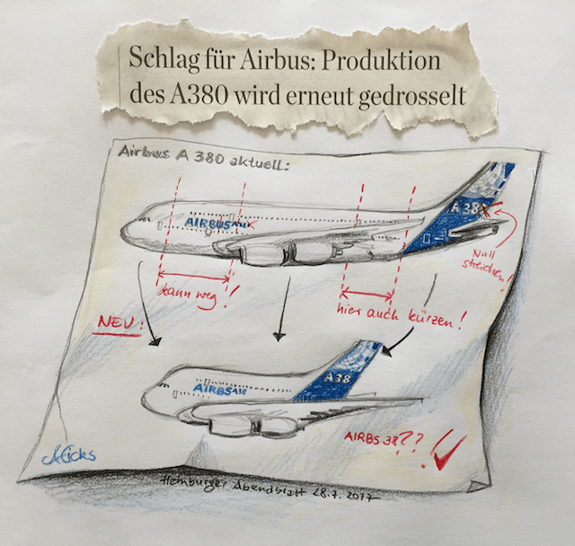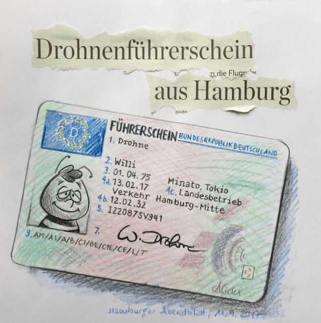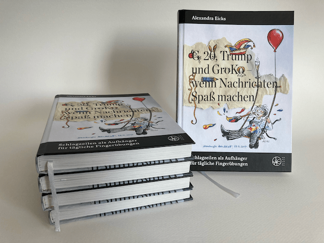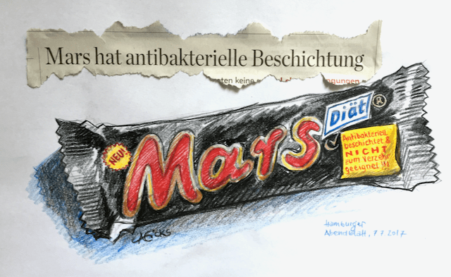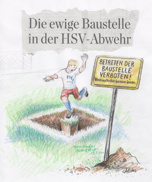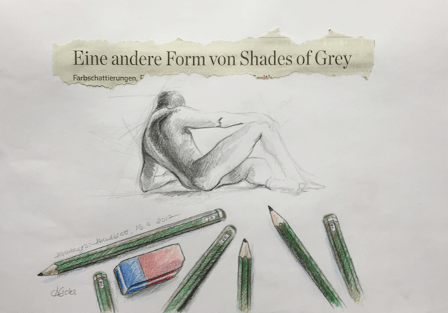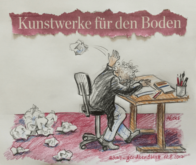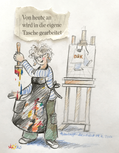 Das selbst auferlegte Trainingsprogramm: Bei der morgendlichen Lektüre des Hamburger Abendblatts wird eine Schlagzeile des Tages ausgewählt. Diese ent-lockt meinem Kopf hintergründige, mehrdeutige oder kuriose Ideen. Um sie festzuhalten, sind nur Farbstifte erlaubt … und ein maximales Zeitlimit von 15-30 Minuten! Dann muss die Umsetzung stehen. Nicht selten Schmunzel-Anlass genug für diesen Tag.