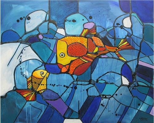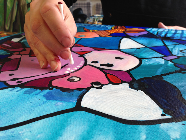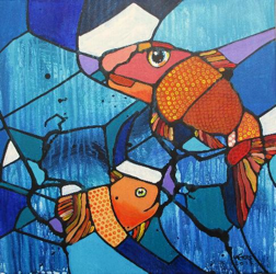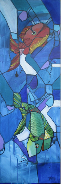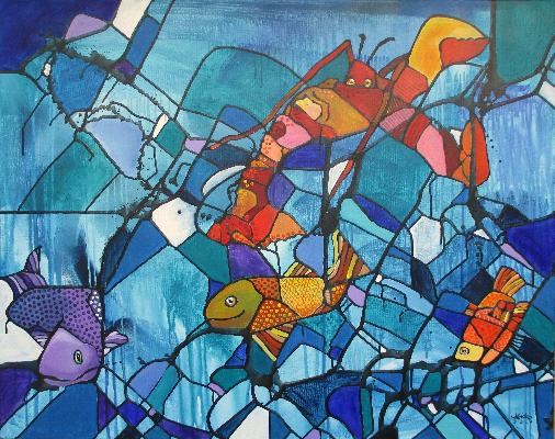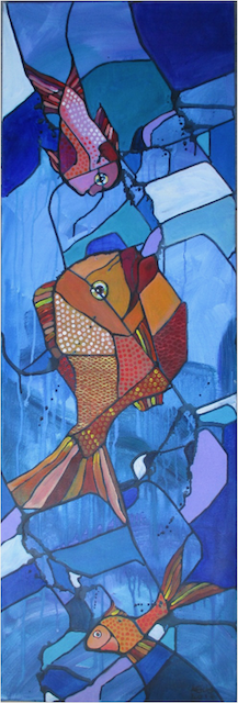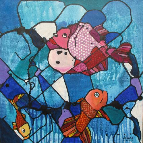 Nicht nur ein abschließender, sondern ein ganz wesentlicher Teil des kreativen Schaffensprozesses ist die Titelgebung: Im Wechselspiel des ungebundenen Assoziierens und der prozessbezogenen Freude an Farben und Formen entstehen humorvolle Bildnamen, welche die finale Assoziation festhalten: BLASIERTER BUTT, BESUCH BEI HERRN LOBSTER, DER AUFSTEIGER, HOCHNÄSIG, und andere …